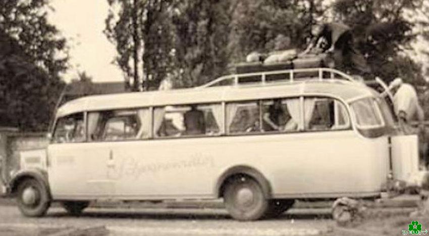 Es dürften die Fünfziger Jahre gewesen sein, als dieser Schwanenritter-Bus mit den restlichen Gepäckstücken der Reisenden bepackt wurde. Dafür stieg der Busfahrer auch aufs Fahrzeugdach. Der Bus hatte zu dieser Zeit – so sieht es weningstens aus – noch selbstgewirkte Gardinen vor den Fenstern. Wer ist mal damit gefahren?