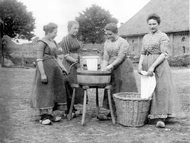 Hier sehen wir einige Mägde, die die Wäsche aus der Lauge genommen haben, um sie durch die Holzrolle einer Wringmaschine zu drehen, damit so das Wasser heraus gepresst wird. Damals war noch stramme Handarbeit gefragt.