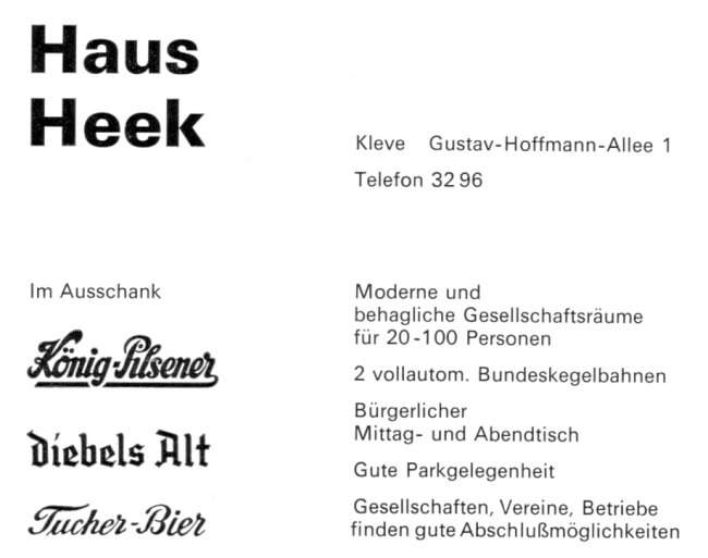 Die Gaststätte Haus Heek in Kleve dürfte vielen Einheimischen noch in Erinnerung sein. Interessant in dieser Werbung aus den Sechzigern ist die Bemerkung: „Gesellschaften, Vereine, Betriebe finden gute Abschlußmöglichkeiten“.