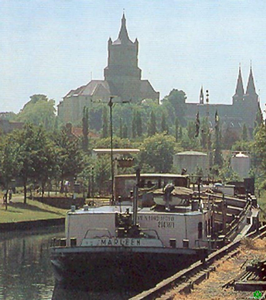 Auf diesem älteren Foto sehen wir ein Schiff mit dem Namen „Marleen“ im Hafen von Kleve. Es ist leider nicht überliefert, ob das gleichnamige Lied von Marianne Rosenberg etwas damit zu tun hatte. Ob es Fracht aufnimmt oder da lässt, erschließt sich hier nicht, aber die Grünanlagen im Hintergrund sind allemal sehenswert. Sie existieren leider nicht mehr. 🙁
