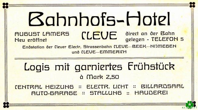 Urige Geschichte: Bahnhofs-Hotel Cleve mit Hauderei Posted on2. Juli 202513. Mai 2025inCategoriesWerbung von Gestern Urige Geschichte: Bahnhofs-Hotel Cleve mit Hauderei Eine interessante alte Werbung von der Neueröffnung des Clever Bahnhof-Hotels. Die Telefon-Nr. 5 deutet … WeiterlesenUrige Geschichte: Bahnhofs-Hotel Cleve mit Hauderei