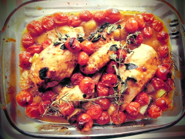 Nun brauchste bloß noch Brühe dran schütten, die Tomaten unn die übrigen Kräuterzweige mit in die Form schmeissen unn nochma so um die 30 Minuten fertich garen.