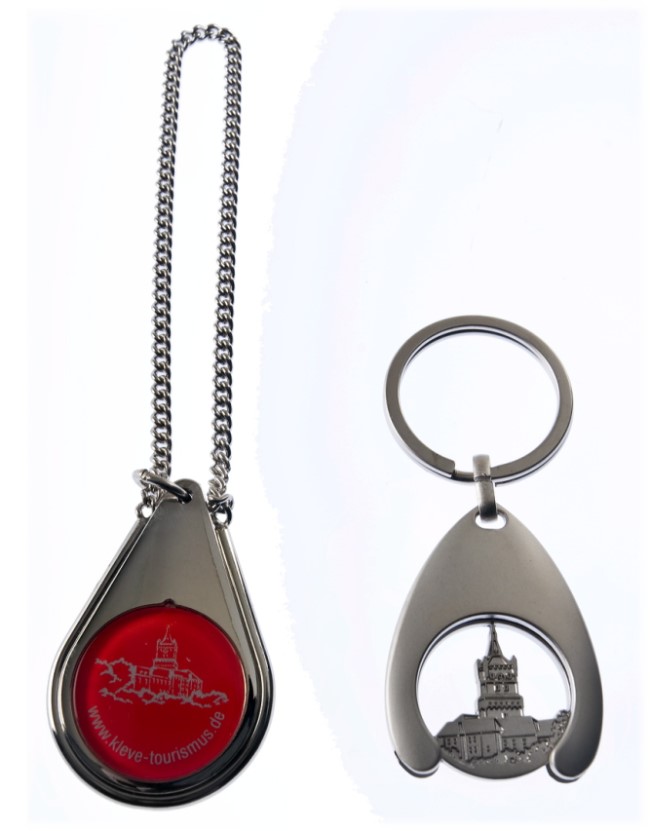 Mit den beiden Schlüsselanhängern tritt das Problem nicht mehr auf, denn ohne Schlüssel aus dem Haus geht hoffentlich niemand. Und Auto fahren ohne Schlüssel ist wohl auch schwierig. Die Klever Schwanenburg ist als Einkaufschip in den schicken Schlüsselanhänger aus gebürstetem Metall eingearbeitet und befindet sich in einer schönen Geschenkhülle.