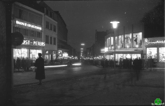 Die Stadt war proppenvoll an diesem Abend, was immer der Grund dafür war. Die Große Straße war zwar noch keine Fußgängerzone, aber es ist kein Autoverkehr ersichtlich. Auch alle Parkplätze sind frei. Man erkennt noch sehr schön die Leuchtreklamen von Feinkost-Peters, Strumpfkörbchen, dem Burgtheater und der Barmer Ersatzkasse hier am Fischmarkt.