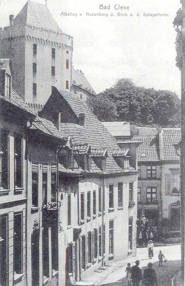 Wir schauen hier auf den Abstieg vom Hasenberg in die Große Straße und sehen oberhalb majestätisch den Spiegelturm.
