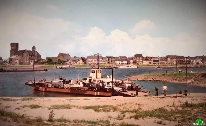 Die Emmericher Rheinbrücke stand noch nicht, aber trotzdem wollte man zu dieser Zeit schon bequem aufs jeweils andere Ufer kommen. Dazu dienten dann zwei Fähren, von denen wir hier eine kurz vor der Abfahrt oder Ankunft sehen.