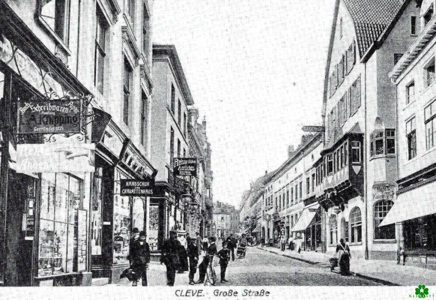 Es waren andere Zeiten und die Große Straße hatte noch nicht viele Autos gesehen.Links sehen wir den Schreibwarenladen von A. Knipping. Dahinter ein Handschuh- und Crawattenhaus, mit dem man heute kein Millionär mehr werden würde. Dahinter dann ein Laden mit Reiseandenken und Ansichtskarten, die es heute nicht mehr soviel gibt.