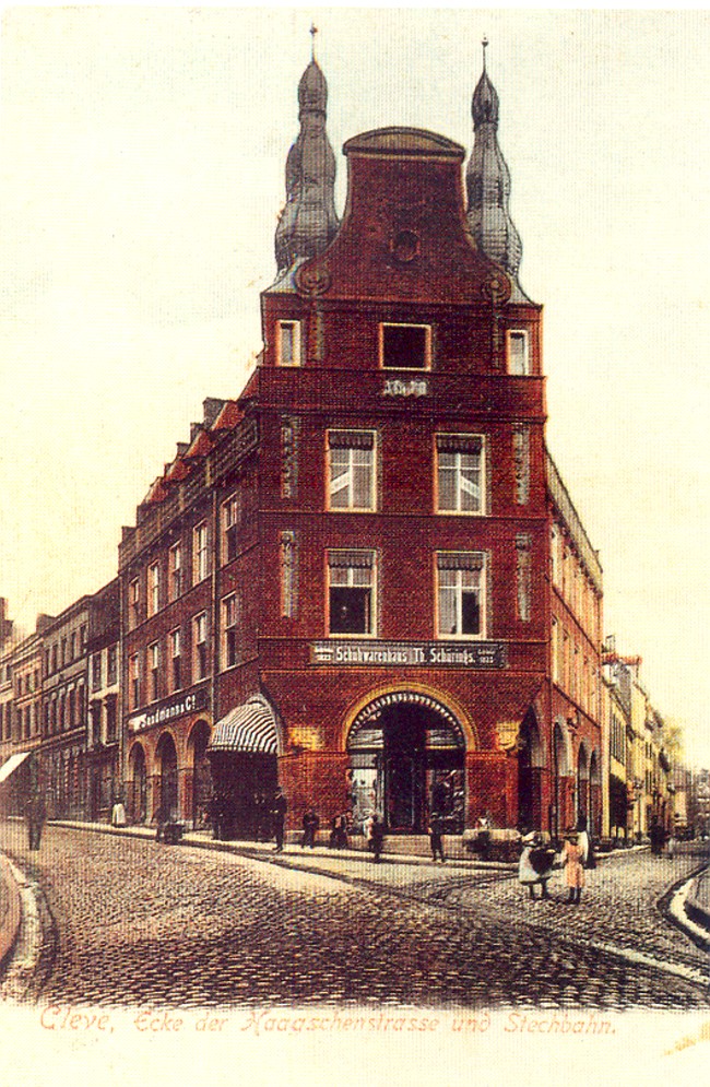 Nicht das Cafe‘, sondern das Schuhwarenhaus von Theodor Schürings war zu Anfang der Fertigstellung des bekannten Gebäudes in Cleve beheimatet. Die Giebelfront war im Jahre 1902 gerade fertiggestellt worden und man kann noch die schräg geklebten Schilder mit der Botschaft „Zu vermieten“ in den oberen Fenstern entdecken.