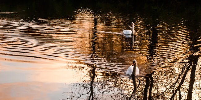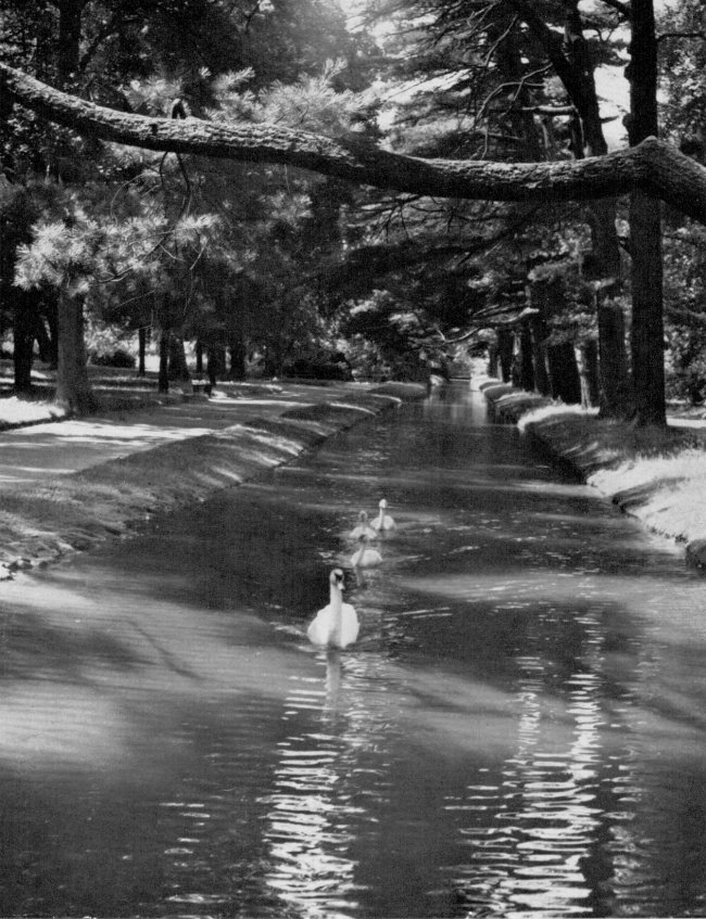 Majestätisch sieht man hier die Schwäne in Kiellinie unter den Ästen der Weymouthkiefern hindurch gleiten. Es war das Ende der fünfziger Jahre.