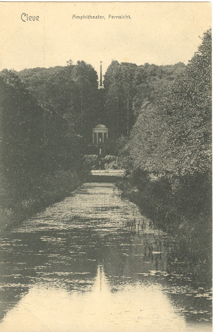 Auf diesem Bild sehen wir über den Prinz-Moritz-Kanal zum Amphitheater mit Cupido, Minerva und Ceres im Tempel. Darüber thront das Kriegerdenkmal mit dem Kupfernen Knopf. Die Uferböschung war noch nicht befestigt und ein Fußgängerweg rund um das Gewässer, so wie wir es heute kennen, gab es damals noch nicht. Ein interessanter Eindruck aus der Klever Historie.