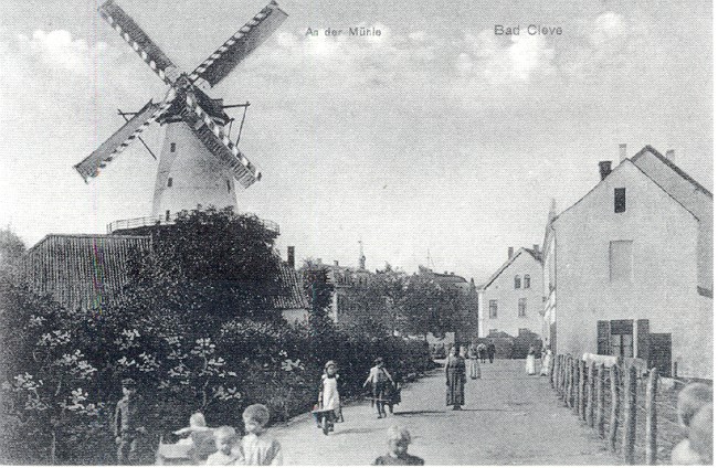 Hier sieht man die stolze Mühle des Klever Besitzers Heinrich Teurlings, die man damals auch als die Große Mühle bezeichnete, was sie zweifelsohne war. Es ist kurz bevor die Weberstraße in die damalige Kasernenstraße einmündete. In dem alten Haus unterhalb der Windmühle und an der Kasernenstraße gelegen, betrieb Emil Wirtz zunächst einen Wäschereibetrieb und danach das erste Autotaxi-Unternehmen innerhalb Bad Cleves. Wie man ebenfalls bemerkt, waren derzeit die Menschen stets zu Fuß unterwegs.