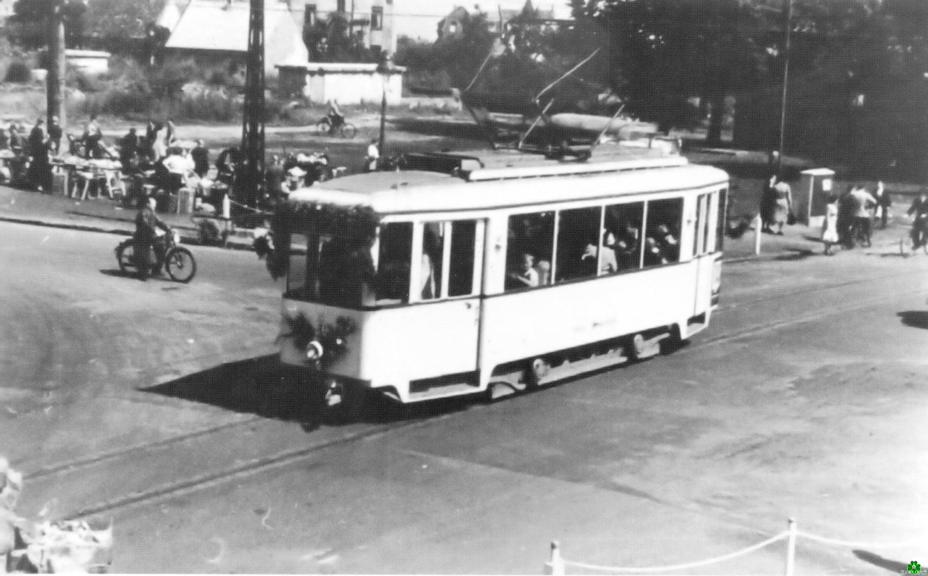 Die Straßenbahn fährt hier gerade am Marktplatz vorbei im Jahre 1956. Es gab dort noch keinen Parkplatz, er war nur halb so groß wie heute und wurde von wilden Sträuchern begrenzt. Die Marktbeschicker boten ihre Waren noch auf Tischen an und es handelte sich auch um eine überschaubare Anzahl.