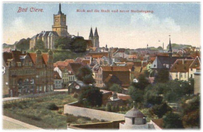 Diese wunderschön kolorierte Ansichtskarte aus dem vergangenen Jahrhundert zeigt Ansichten aus Bad Cleve von 1920 mit dem neu gestalteten Stadteingang.