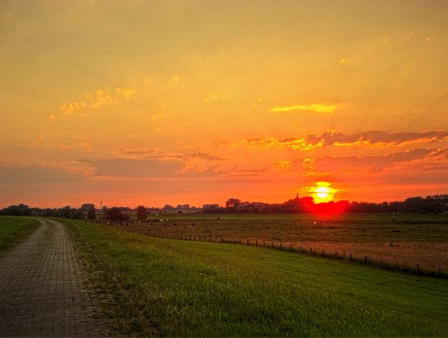 Abendstimmung bei Düffelward Einem Gemälde gleich sehen wir hier die untergehende Sonne am Deich in der Nähe von Düffelward. Ein wundervolles Beispiel von der Schönheit des Kleverlandes in den Niederungen. (Foto: Christian Flock)