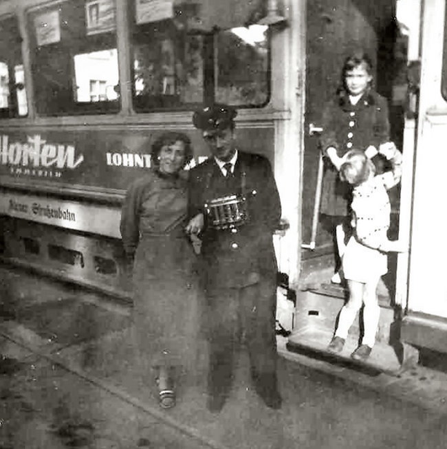 Vater hatte Sonntagsdienst und sorgte dafür, das alle Fahrgäste der Klever Straßenbahn ihren Fahrpreis entrichteten. Also vertrieb Mutter ihm ein wenig die Zeit und besuchte ihn mit den Kindern an einer Haltestelle. Schön, das dieses Zusammentreffen auf Platte gebannt wurde. Wir schrieben hier immerhin das Jahr 1959.