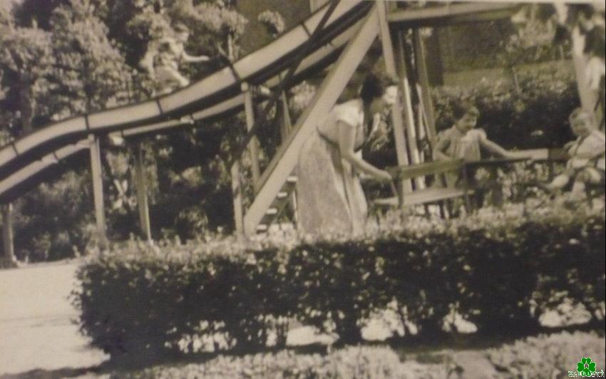 Bist Du hier auch herunter gerutscht? Wir sehen hier eine Mutter mit ihren beiden Kindern vor der elegant geschwungenen Rutschbahn vom alten Waldschlösschen in Donsbrüggen. Wer hat sich damals denn hier auch hinunter gewagt? (Foto gezeigt von August Winterberg)