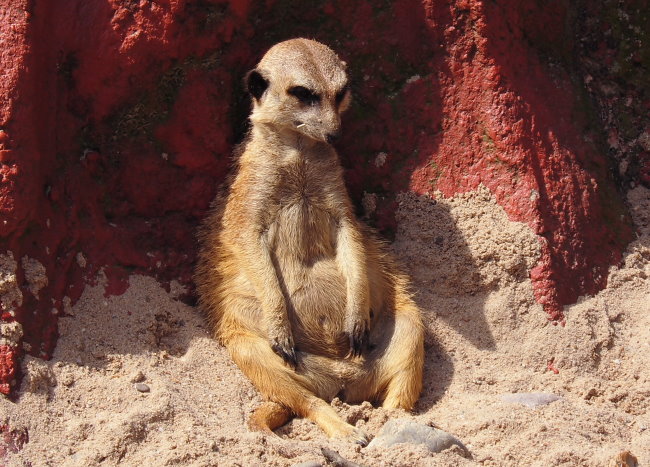 Es ist unübersehbar, dass es dem Erdmännchen im Klever Tiergarten ein wenig zu heiß ist. Aber anstatt in die schützende Unterkunft zu gehen oder sich in den Schatten zu setzen, bleibt es stur in der prallen Sonne sitzen. Es scheint übrigens das Oberhaupt der Sippe zu sein, denn die anderen Erdmännchen schauten regelmäßig vorbei um zu sehen, wie es ihm geht.