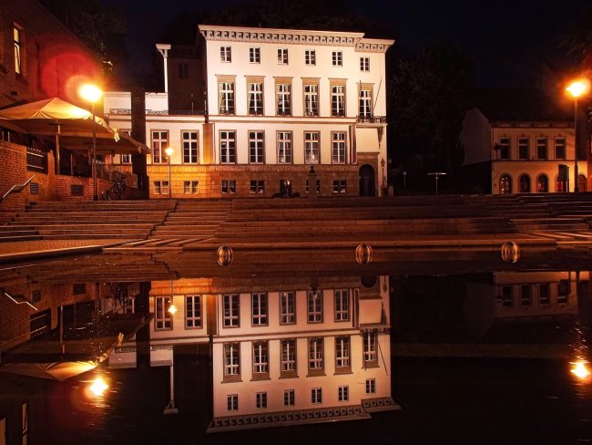 Das doppelte Museum von Kleve Zweimal Museum Haus Koekkoek. Ein faszinierender Anblick. Bei Windstille und wie ein Spiegel wirkendem Wasser der schönen Anlage auf dem Koekkoeksplatz sieht man das Gebäude doppelt. Ein Abend der Überraschung. (Foto: Christian Flock)