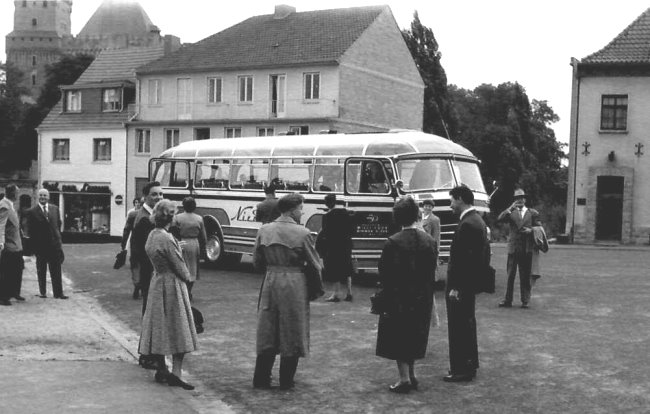Ein bekanntes Bild aus den 50er und 60er Jahren. „Der vom Niederrhein“ parkt auf dem Kleinen Markt in Kleve um Fahrgäste für eine Kurz- oder Fernreise aufzunehmen. Oder sind die in ihrer für damals typischen Kleidung wartenden Menschen gar Gäste aus einem anderen Ort und machen hier Rast? Zumindest können sie dann auch die Baulücke bewundern, die noch einen Blick – vermutlich bis Kellen – freigab.