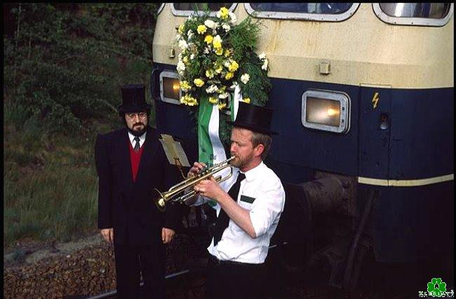 Hier sehen wir die letzte Fahrt des Personenzuges. Als Abschied wurde von diesen Herren, die sich entsprechend dem Anlass als Totengräber verkleidet hatten, an jeder einzelnen Haltestelle der „Todesmarsch“ gespielt. Auch ein diesbezüglicher Kranz durfte nicht fehlen.