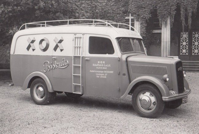 Dieses Fahrzeug transportierte die leckeren Backwaren der Klever Firma XOX und zeigte dies auch deutlich mit einer entsprechenden Werbe-Beschriftung. Ein auffälliges Gefährt, wenn man noch annehmen kann, das die untere Hälfte in Rot lackiert war.