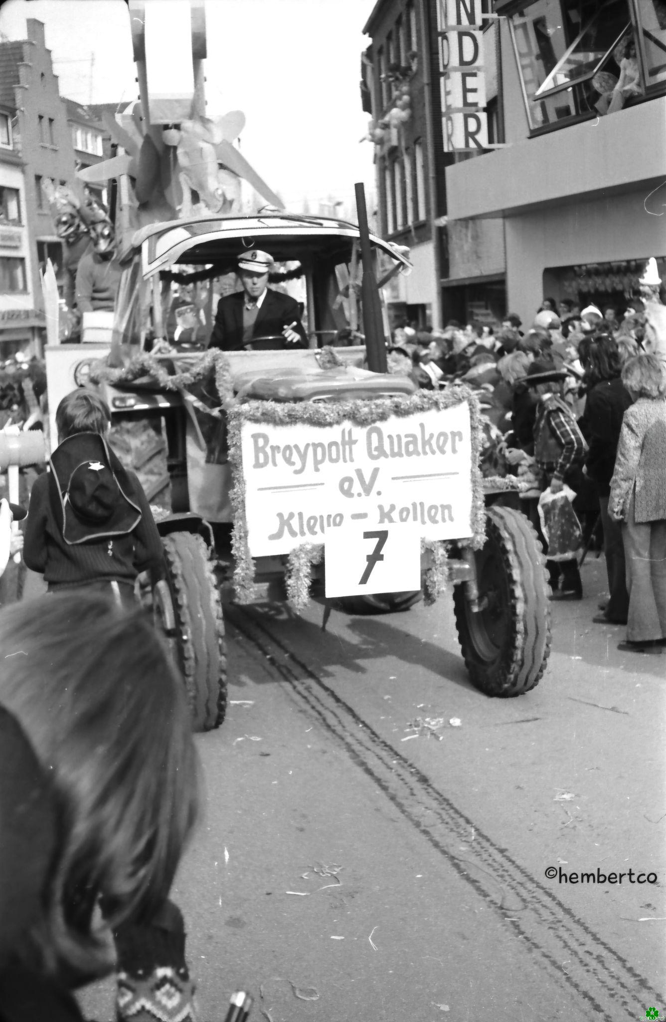 Wie wir hier sehen, schrieben sich die Kellener Karnevalisten dieses Clubs noch mit „y“ und nicht Brejpott-Quaker, wie aktuell. Links Mitte sehen wir einige Mitglieder mit den typischen Froschmasken. Es muss alles in viel Grün gewesen sein. Der Traktor vermutlich auch.