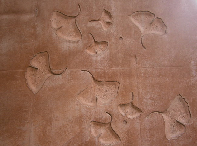 Möglicherweise haben die meisten Besucher des Forstgartens noch nie bemerkt, dass an der Seite des Musik-Pavillons stilisierte Gingko-Blätter in die Wandverkleidung eingelassen wurden.