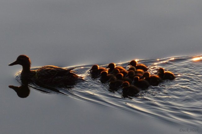 Niedlich oder? In einer äußerst disziplinierten Rauten-Formation folgen die kleinen Enten ihrer Mutter.
