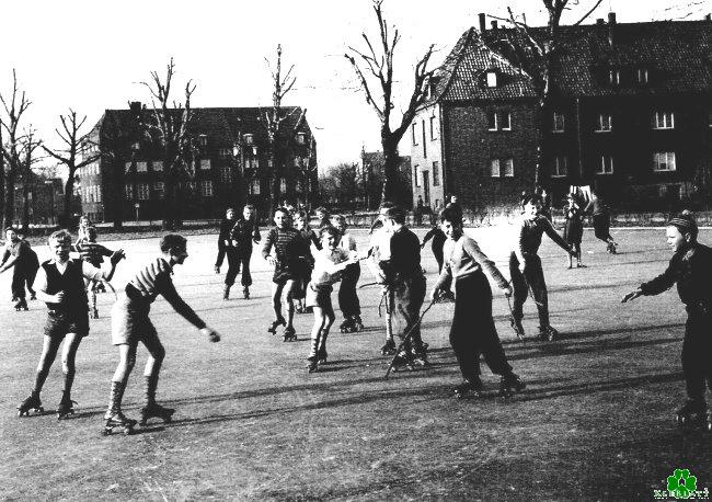 In den Fünfzigern und Sechzigern gehörte das Rollschuh-Laufen zu den beliebtesten Freizeitbeschäftigungen überhaupt. Jeder Junge wollte diese verschiebbare Stahlplatte mit den vier harten Rollen unter seine Füße schnallen. Der Krach, den diese Dinger produzierten, war manchmal unerträglich, aber man war stolz. sich schneller fortbewegen zu können. Hier sehen wir eine Rollschuh-Bahn an der Willibrord-Kirche in Kellen, wo die Kinder es richtig „krachen“ lassen.
