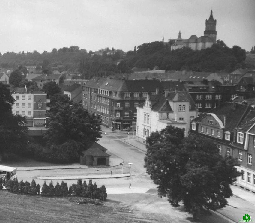 Ein Anblick, den nicht mehr jeder kennt in Kleve Wir sehen mittig die Einfahrt in die Herzogstraße. Darunter erkennt man noch die Verkaufsbaracken diverser Einzelhändler. Die anderen Gebäude haben sich nur unwesentlich verändert. (Foto-Auszug: Fritz Wippich)