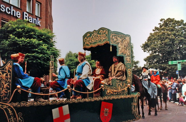 Diesen wundervoll geschmückten Prunkwagen konnte man am 13. September 1992 in den Klever Straßen bewundern. Anlässlich der 750-Jahr-Feier der Stadt fand ein großer Umzug statt mit traditionell gekleideten Teilnehmern. Hier könnten wir Prinz-Moritz mit Gattin sehen oder Anna von Cleve mit Gatten. Wer weiß das wohl?