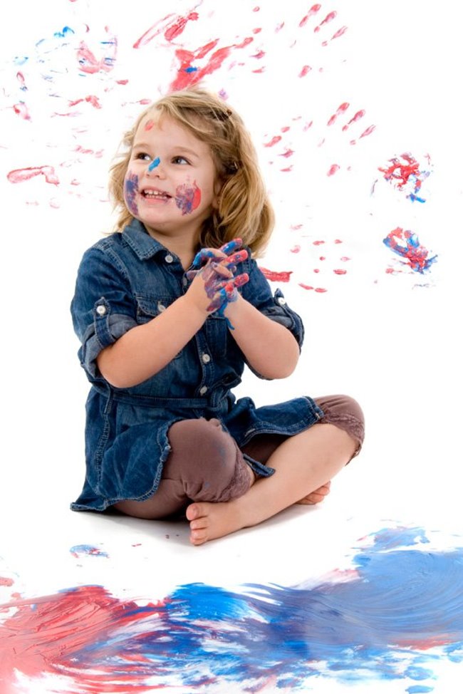 Wem geht nicht das Herz auf angesichts der Farbkompositionen dieser aufstrebenden kleinen Malerin? Ohne Scheu arbeitet sie nur mit ihren Händen und zaubert im besten Stil freischaffender Künstler ebensolche faszinierenden Gemälde. Sie scheint auch selbst ganz begeistert zu sein von ihrem farbigen Werk.