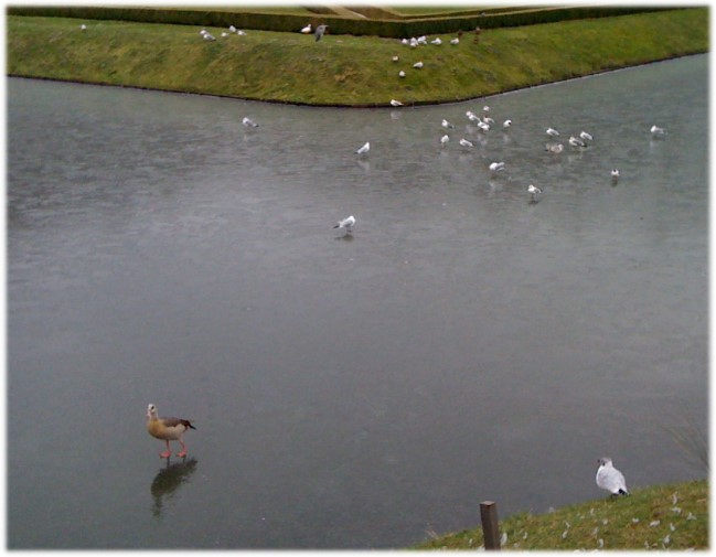 So gerade eben können Enten, Gänse und Möwen noch auf dem Wasser im Forstgarten gemütlich spazieren gehen. Sie sollten aber in Bewegung bleiben, da sie ansonste Gefahr laufen, festzufrieren. Das ist Eislaufen in Kleve einmal anders. (Foto: KLE-Blatt)