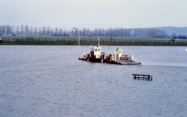 Hier sieht man, wie die Fähre die Menschen von und nach Schenkenschanz übersetzte. Da war es auch echt notwendig, denn wir sehen hier das Hochwasser im März 1988. Ein Weidezaun oder was immer das ist, lässt sich nur noch erahnen.