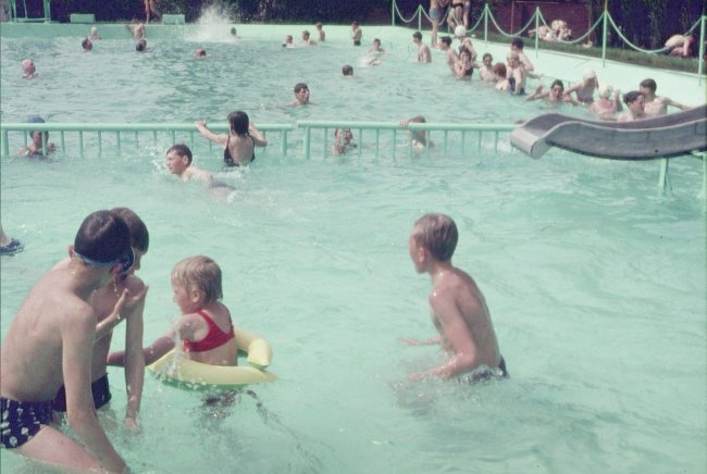 Das legendäre Freibad in Kellen war an manchen heißen Sommertagen heillos überfüllt und dennoch hat man uneingeschränkt gute Erinnerungen daran. Im Vordergrund sehen wir das Nichtschwimmerbecken mit der Rutschbahn. Das blaue Gitter trennte es vom Schwimmerbecken. Die Größe des Freibades war sehr bescheiden. Heute hat vermutlich mancher Hausbesitzer einen größeren Pool in seinem Garten, aber damals war es die erste und einzige Möglichkeit im Raum Kleve, sich sicher und legal in die Fluten zu schmeißen, denn das Baden im Rhein etc. war eigentlich nicht erlaubt. Eigentlich…