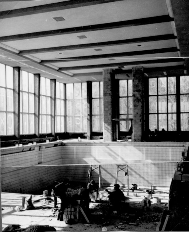 Innenausbau des Klever Hallenbades Es war im Jahre 1957, als das Hallenbad in Kleve gebaut wurde. Hier sehen wir gerade die Arbeiten im Schwimmbecken, wo die Kacheln aufgetragen wurden. Lang ist es her. Wie lange wird es noch stehen? (Foto: KLE-Blatt)