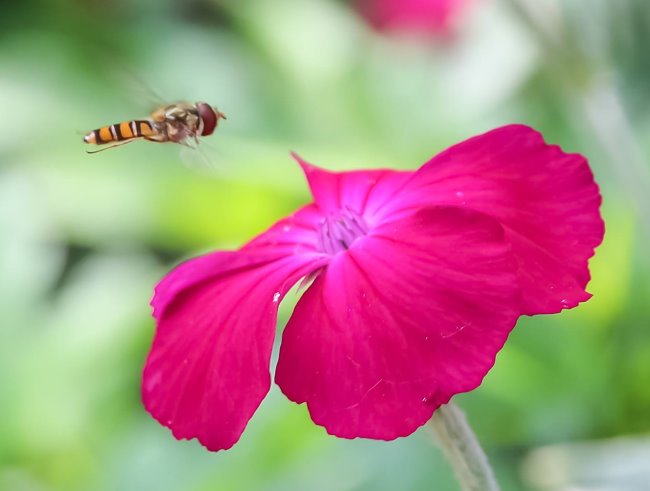 Bei dem auf diesem Bild im Anflug befindlichen Insekt handelt es sich wohl um eine so genannte Schwebefliege, die sich hat anlocken lassen.