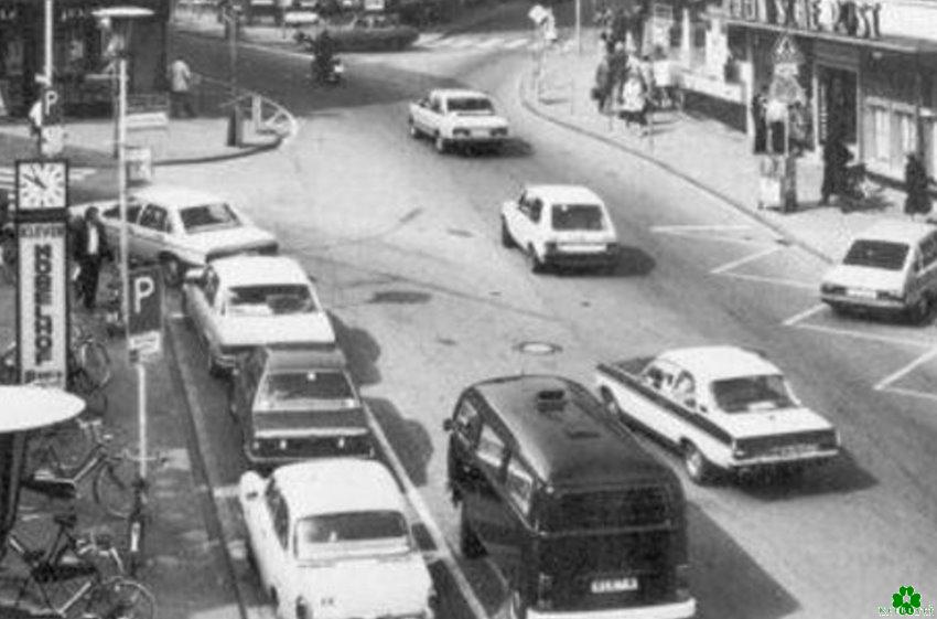 Strammer Verkehr veranlasste die Fußgänger zu erhöhter Aufmerksamkeit an dieser markanten und sehr bekannten Klever Kreuzung. Einige Merkmale waren damals unverkennbar. Daher werden die Meisten noch wissen, wo wir uns hier befinden. Aber nicht Alle. 😉