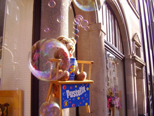 Ganz in diesem Sinne sind bei uns Seifenblasen genau das, was damit gemeint ist, nämlich bunte Blasen aus Seife, die man hier vor Vedes auf der Herzogstraße einmal so sehen konnte.