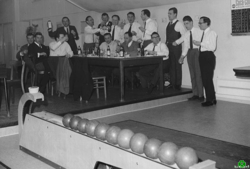 Warst Du in den 50ern bis 70ern auch Mitglied in einem Kegelclub? Hier sehen wir Mitglieder eines Clubs der Union. Die Kugeln stehen auf diesem Bild im Vordergrund. Allerdings waren das damals in erster Linie Geselligkeit, Bier, Schnaps und Zigarretten. 🙂