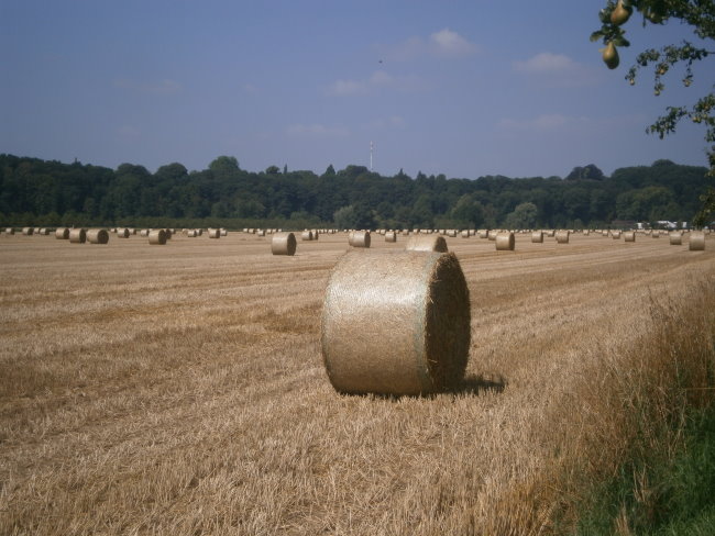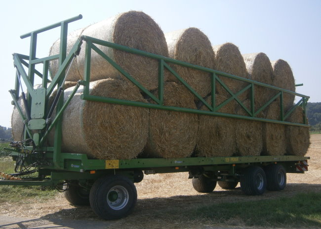 Heutzutage sieht die Sache ganz anders aus. Das Heu wird maschinell zu großen Rollen bzw. Ballen geformt und anschließend mit dem Traktor gestapelt eingefahren.