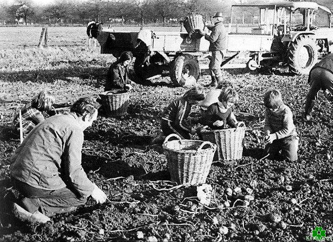 …oder wie es in Hochdeutsch heißt: Kartoffeln ernten. Das war damals in den Fünfzigern noch echte Handarbeit, wobei selbstverständlich auch die Kinder mit eingespannt wurden. Heute würde es gleich Proteste wegen illegaler Kinderarbeit geben und ganze Scharen wären mit ihren Transparenten auf den Klever Straßen unterwegs. Damals scherte sich kein Mensch darum, den Kindern machte es – wenn auch nicht immer – Spaß und geschadet hat es auch nicht. Das wäre heute mal was für die Handy- und Spielkonsolen-Generation. Endlich frische Luft und ein wenig körperliche Betätigung. Keine Lust? 🙂