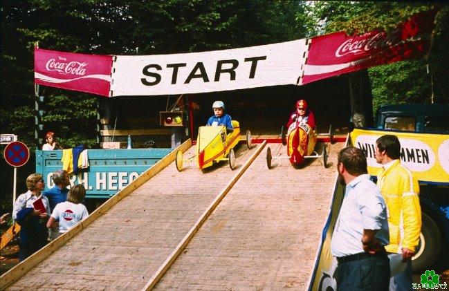Die Firma Heeck hatte für eine entsprechende Start-Rampe gesorgt, die hier in den Siebzigern die angehenden jungen Klever Rennfahrer in ihren selbst gebauten „Boliden“ ins antriebslose Rennen schickte. Von den Vätern kritisch beäugt rollten die interessanten Fahrzeuge so weit, wie es eben ging. Eine aerodynamische Haltung, wie wir es bei den Bob-Fahrern kennen, ist hier nicht ersichtlich.