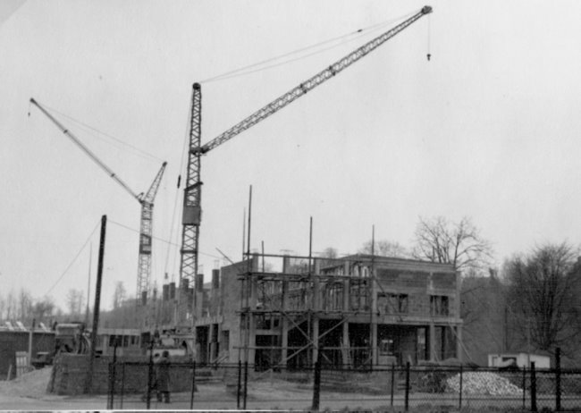 Dieses Bild aus dem Jahre 1957 zeigt den Fortschritt beim Bau des Klever Hallenbades. An gleicher Stelle hatte vorher das legendäre und prachtvolle Stadtbad gestanden, das allerdings im 2. Weltkrieg leider komplett zerstört wurde. Es blieb nur noch ein Treppenabsatz vom Eingangsportal übrig.