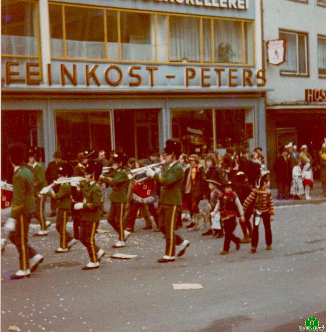 Ein Spielmannszug mit grüner Uniform marschiert hier gerade vorbei an der Hosenzentrale und Feinkost Peters. Beide Geschäfte existieren schon lange nicht mehr und so kann man erahnen, wann in etwa dieser Rosenmontag gefeiert wurde.
