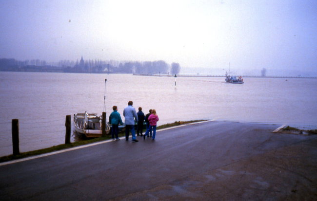 Im Jahre 1988 war der Wasserpegel sehr hoch und die Fähre hatte einige hundert Meter mehr zurückzulegen als unter normalen Wetter-Bedingungen. Hier warten einige Leute auf die in einer solchen Phase einzige Möglichkeit, nach Schenkenschanz zu kommen. Es sei denn, man verfügte über das nötige Kleingeld für einen Heli. 🙂