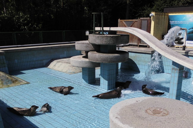 Bei so vielen Seehunden muss auch ab und zu das Beckenwasser gewechselt werden. Ungeduldig warten die Tiere dann auf die Neubefüllung. Man merkt ihnen an, dass sie ohne ihr Element keinen wirklichen Spaß haben und so rollen und kriechen sie über den sich langsam feuchter werdenden Boden oder nähern sich dem wasserfallartigen Strahl, aus dem das rettende Nass wuchtig heraus strömt.