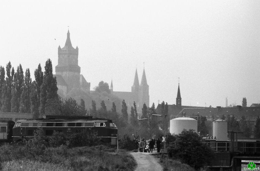 Wer kennt denn diesen Bahnübergang? Ein Zug fährt gerade an diesem unbefestigten Übergang vorbei, wo einige Menschen warten. Im Hintergrund sehen wir die Schwanenburg, die Stiftskirche und die Minoritenkirche. Wo also warten die Leute hier? (Bild gezeigt von Bos Hape)