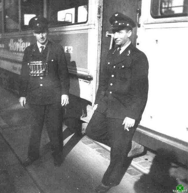 Da fuhr sie noch – die Klever Straßenbahn. Wir sehen hier zwei Mitarbeiter der Bahn bei einer Zigarettenpause an einer End-Haltestelle. Der Schaffner trägt noch seinen Wechselgeld-Kasten um den Hals, der damals üblich war. Wir schrieben das Jahr 1959.