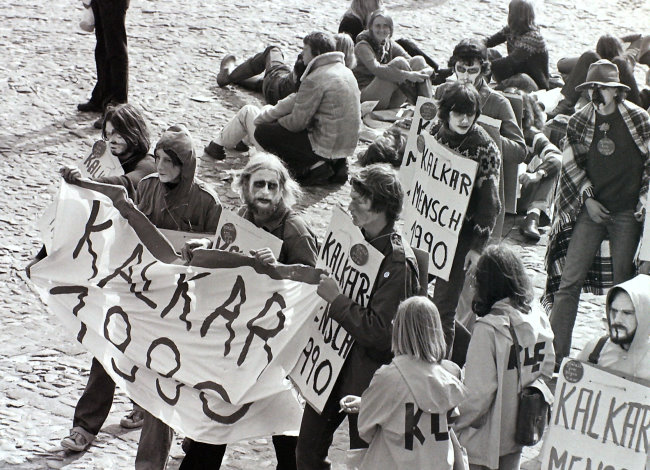 Am 24. September 1977 wurde in Kalkar gegen den schnellen Brüter demonstriert, obwohl auf den Transparenten 1990 steht. Fast hat man beim Anblick dieses Fotos den Eindruck, das es sich eigentlich um eine Karnevalsveranstaltung handeln würde. Viele Gesichter sind weiß geschminkt mit diversen gruseligen Zusatz-Malereien. Fast wie aus einem Zombie-Film, was damals wohl auch der Sinn der Sache war.